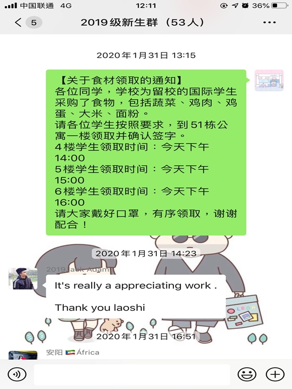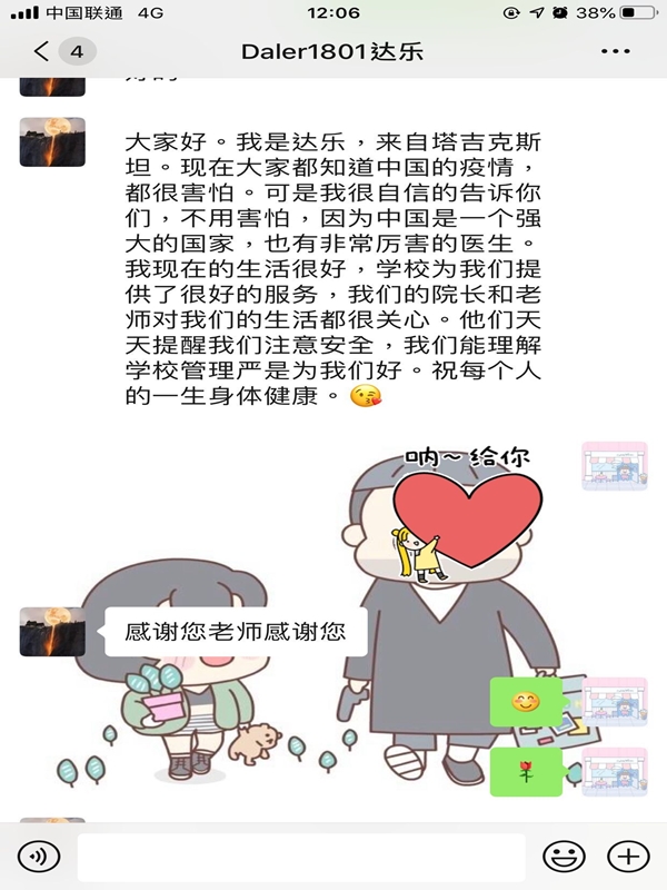 这是国际学院来自塔吉克斯坦的学生达乐的聊天留言,国际学院辅导员陈洁,提前结束寒假休息状态,保持24小时通讯畅通,每日汇总并上报在校留学生的信息,通过微信群等渠道积极宣传科普知识,引导学生不造谣、不信谣、不传谣,用实际行动宣传和教育学生。自实行公寓全封闭管理以来,配合学校为在校留学生统一采购和分发所需食材;配合联系超市人员,根据学生需要,为学生统一采购和分发生活用品。及时关注学生思想动态,做好解释和安抚工作。