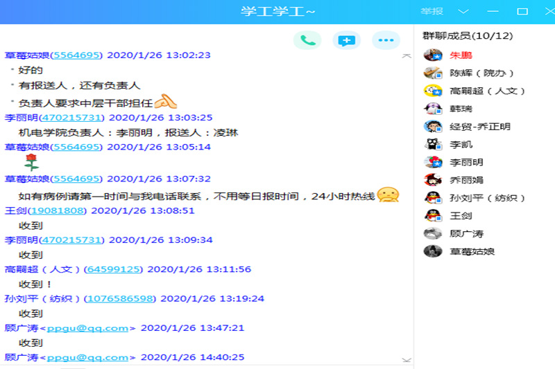 这是学生工作处处长李洁琦在工作群的留言,在疫情面前,冲锋在前,靠前指挥,她高频地出现在“学工学工”学生工作分管领导群、“常纺学工办”学工办主任、“3044永利集团官网辅导员”、“新冠学生信息临时群”等工作群,第一时间传达国家、江苏省、常州疫情相关的文件精神,分享优秀的院校的疫情相关的推送微文供大家学习、分享、讨论,为数据统计献计献策,解决疑惑,成为学生工作一线工作人员的坚强后盾。疫情发生后,学生工作处在校官微发出了《我校开通线上大学生心理辅导员服务》、《致常州纺院全体辅导员、班主任的一封信》、《致3044永利集团官网全体学生的一封信》等及时的防疫文章。